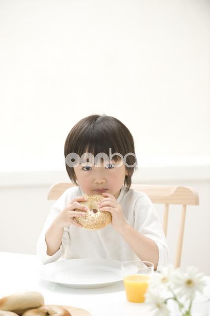 | 子供 | クッキング・食事 | ご飯・パン | 人物 | 日本人 | 男の子 | 一人 | 1人 | インドア | 屋内 | 室内 | ダイニング | 食卓 | 朝食 | 食事 | オレンジジュース | パン | 食育 | ベーグル | パン食 | 洋食 |